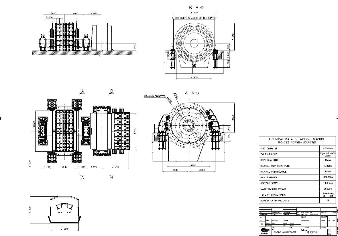 本項目為JKM-4.5×6(Ⅳ)型多繩摩擦式提升機成套裝備是由同步交流電機和主軸裝置組成。無減速器,由摩擦輪主軸與電機直聯(lián),低速交流同步電機拖動(59r/min),功率為(2*3500kW),閘控系統(tǒng)為盤式閘制動方式,中高壓恒減速液壓站控制(14MPa)。